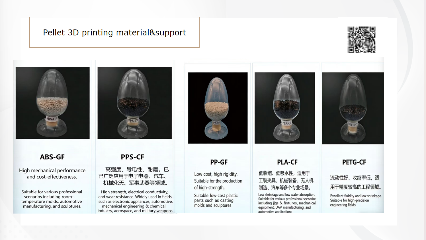 Directly utilizes thermoplastic pellets or fiber-reinforced pellets, bypassing cost constraints of traditional filament, perfectly adapting to high-performance composite material requirements, and customizable composite materials are available to meet diverse performance needs.